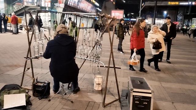 Уличный музыкант играет на бутылках