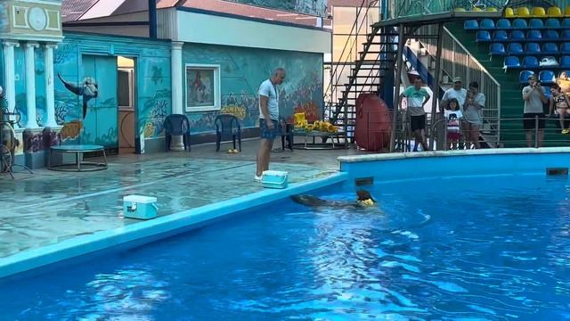 Алиса Болгова катается на дельфине Злата. Дельфинарий Небуг.