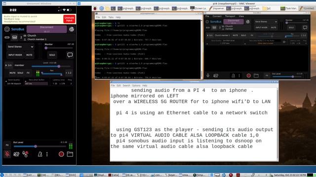 https://sonobus.net/ The PI4 in this demo was using only its ALSA AUDIO ENGINE and the ALSA LOOPBACK VIRTUAL AUDIO CABLE... the media player used in this demo - gst123: https://www.systutorials.com/docs/linux/man/1-gst123/ the audio you hear on this demo is from the IPHONE through the IPHONE MIRROR APP https://github.com/FD-/RPiPlay