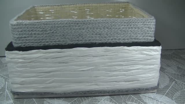 Декор картонной коробки пекарской бумагой и пряжей .