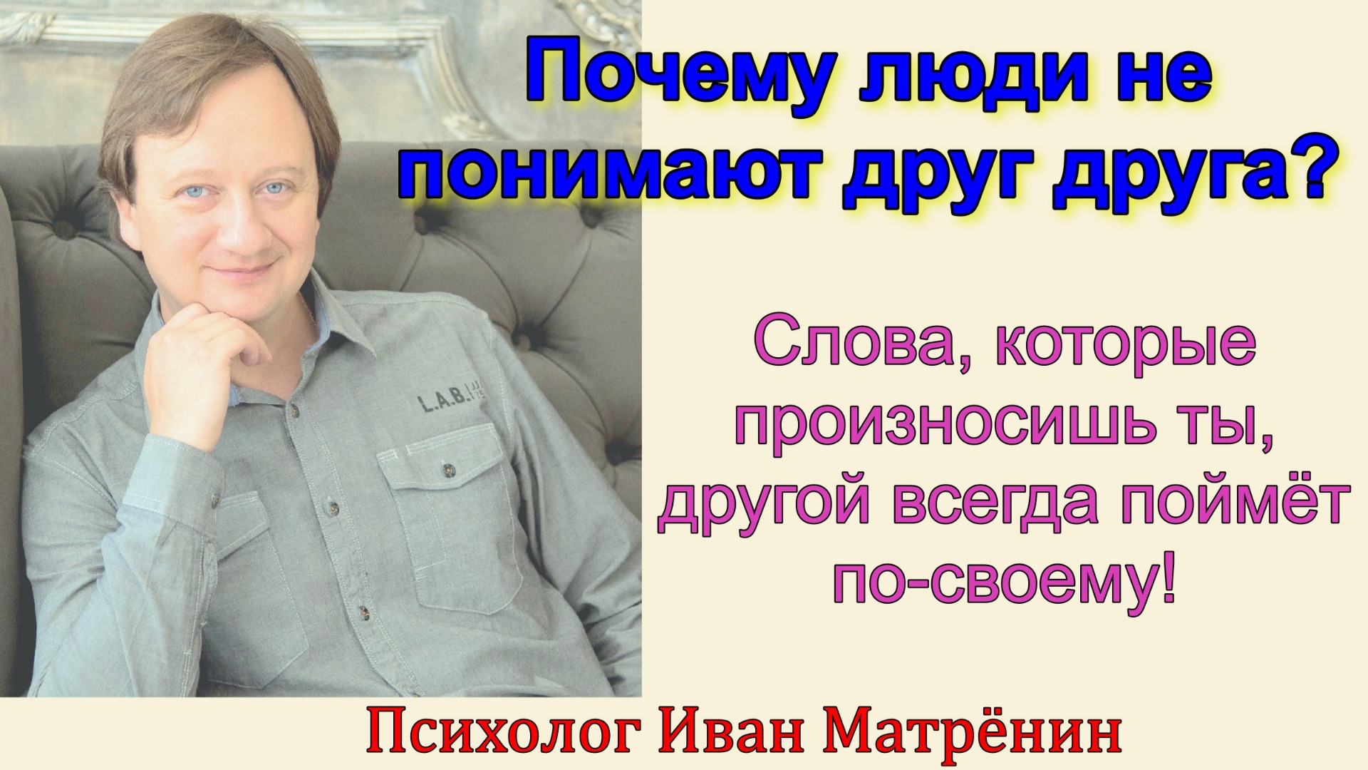 В этом видео я на одной из проводимых групп рассказываю о том, от чего зависит восприятие слов людьми. О тех ошибках, которые делают люди расшифровывая значение сказанного им и о той большой ошибке, когда свои слова воспринимаются как обязательно однозначно понятными для всех. Подробнее, в этом видео. Приятного просмотра! Также можете смотреть это и другие видео у меня в аккаунте Instagram - https://www.instagram.com/sem.psiholog/ в IGTV! Там много текстов и видео на эту и другие темы по психологии и отношениям. Контакты: эл. почта – myvan@mail.ru. Телефон, WhatsApp, viber, telegram - +7 965 605 46 99 Соц. сети: Сообщество Facebook: группа - Иван Матрёнин Психология отношений – https://www.facebook.com/ivanmatreninpsi адрес в одноклассниках личный - https://ok.ru/myvan адрес вконтакте личный – Иван Матрёнин – https://vk.com/matreninivan Получить консультацию online на b17 - https://www.b17.ru/matrenin/ Мои сообщества Вконтакте: группа – «Психология семьи и отношений. Иван Матрёнин» – https://vk.com/ivan_matrenin группа – «Психология на русском языке и для наших людей» - https://vk.com/psiholog_matrenin группа – «Стройность от психолога. Блог Ивана Матрёнина» – https://vk.com/stroinost_matrenin группа – «Про гипноз и НЛП» - https://vk.com/gipnoz_matrenin Вступайте, пишите! Видео можно посмотреть на моём канале в YouTube - http://www.youtube.com/c/ПсихологИванМатрёнин. Ссылка на это видео в YouTube - https://youtu.be/3Cm2_aSRIAQ Ссылка на это видео в Rutube - https://rutube.ru/list/video/4cb0299b4b77133f8d6eb71368c59325/ Ссылка на это видео в вконтакте - https://vk.com/video19642848_456239800 Ссылка на это видео в яндекс дзен - https://zen.yandex.ru/media/id/5d301a1825667300b5bd0742/pochemu-liudi-ne-ponimaiut-drug-druga-slova-kotorye-proiznosish-ty-drugoi-vsegda-poimet-posvoemu-5e5ce605abb82a51e9efc756 Ссылка на это видео в одноклассниках - https://ok.ru/video/1663815846410 Ссылка на это видео в фейсбук - https://www.facebook.com/275253282909078/videos/2542865059367302