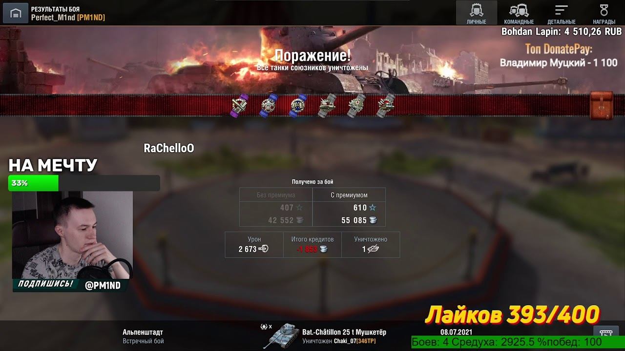 Поддержать стримера рублем - https://www.donationalerts.com/r/pm1nd https://donatepay.ru/don/pm1nd Мастер = 500р (танки которые нельзя заказывать на мастер - виндикатор, унылый песок) Бабаха - 2к, Йох - 5к, Виндикатор - 10к, ТВП/Крушитель - 20к ✔️Через донат можно не только задать вопрос, но еще и: - прокатить определенный танк - 152р - чек статы в конце стрима(=150р). Сразу после боя - 300р. - поставить музыку на стрим - 200р - взвод на пару каток (обычно 3, если есть очередь) - 200р - оценить реплей боя (предварительно прислать на почту pm.blitzreplay@gmail.com ) - 500р Для тех кто действительно хочет помочь: - удалить танки на неделю - 100 000р - приехать в ваш город (РФ) и удалить танки ВАМ (под ключ со всех устройств) - 150 000р Мой второй канал по Большим танкам, в будущем ТКМ и про тачки - https://www.youtube.com/channel/UCkX7Sy9t3DSYa1V6u441HbQ Вступить в семью интеллигентных танкистов или просто спонсорка (смайлы + выделение в чате + бонусы + ты помогаешь ютубу продвигать мой канал очень сильно) - https://www.youtube.com/channel/UCmKYhDzvo9DrX2em0AOSQJA/join Шпаргалка Танкиста - https://docs.google.com/presentation/d/1WW86z3bgtSgWerpsoruDF1618aN3CXuQBq3937oxB6E/edit#slide=id.p1 Топ Годных Премов - https://sun9-26.userapi.com/impg/Ey38bqAJ5qfkQU9Dq4GqiwsByzuUQB7dwyXFmw/32TsavUBMAk.jpg?size=600x600&quality=96&sign=544095e2907ddb23f16ed68afbe22ac2&type=album Канал с Нарезками - https://www.youtube.com/channel/UCSK2BaGA06o5qD6Nqpuh4hw Реплеи слать сюда - pm.blitzreplay@gmail.com По вопросам сотрудничества, пиар канала, реклама в сообществе - PM1ND@hmd.one ИНСТАГРАМ - https://www.instagram.com/pm1nd Группа ВК (вступаем) - https://vk.com/pm1nd Телеграм PM1ND - https://t.me/pm1nd Страница ВК (добавляемся в друзья) - https://vk.com/id10179989 Discord - https://discord.gg/vDNnXh6 ВСЕ ТОНКОСТИ КАРТЫ здесь - https://www.youtube.com/channel/UCD7aNsZhb79WpRd4RNh5X0A Играю с iPad Pro 11" 2018 64gb. Характеристики ПК есть в инстаграме. В игре бан чата, поэтому не могу ответить. :( Стримлю через OBS и X-Mirage. Виджет статы - https://widget.pythonanywhere.com/ #стрим #wotblitz #вотблиц #wot #WorldOfTanksBlitz #WorldOfTanks #PM1ND