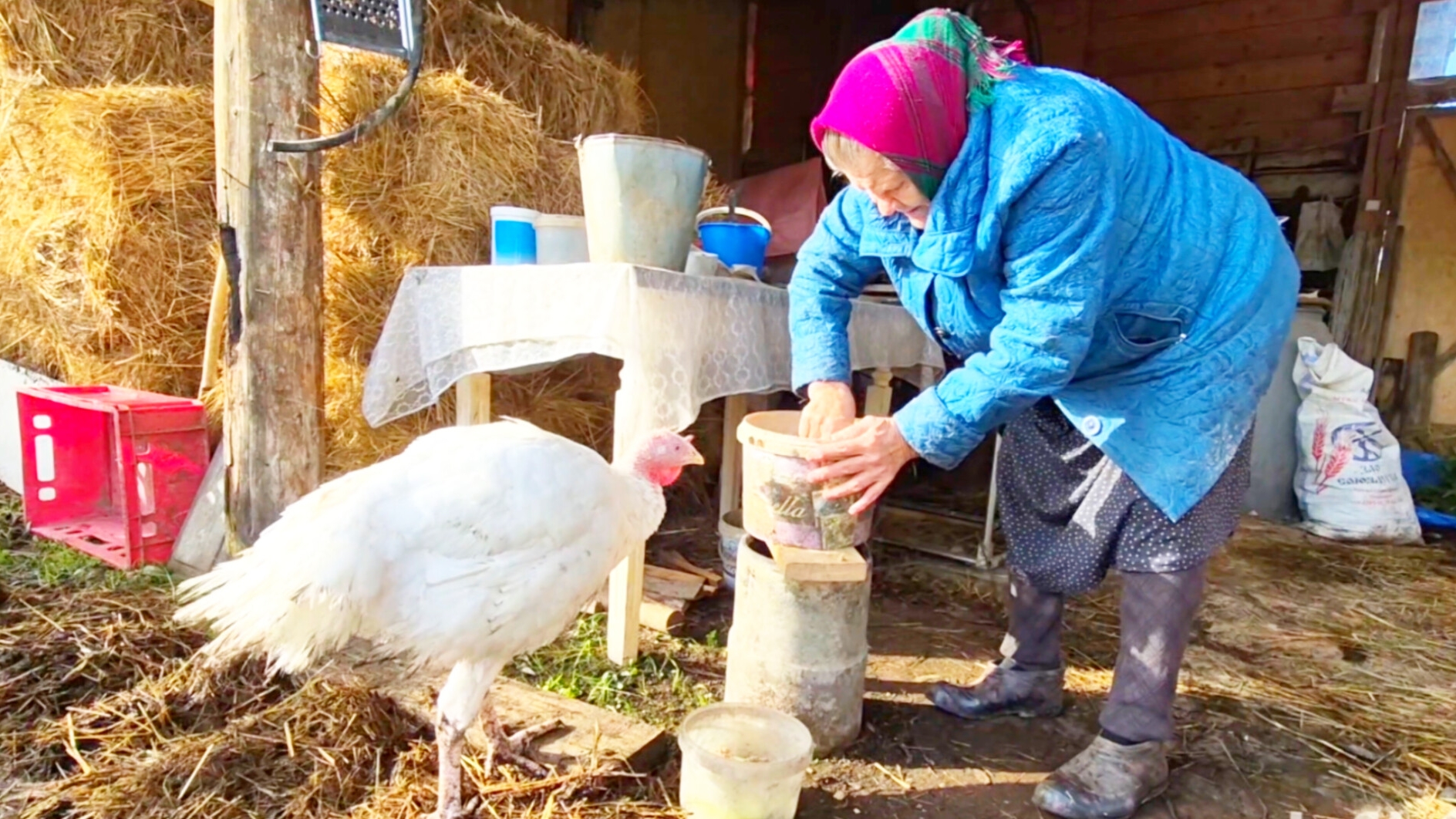 Моя Деревня На Алтае,на хозяйстве,Бабушка кормит любимого индюшонка
