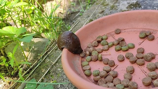 Слизень ест из миски кота