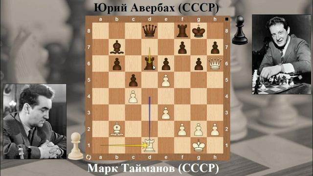 Рассмотрение одной из интереснейших партий турнира претендентов 1953 года в Цюрихе, сыгранной в 6 туре между Марком Таймановым и Юрием Авербахом Марк Тайманов очень изобретательно и энергично вел наступление на крепкую, но достаточно статичную позицию своего соперника. Главную роль в этой игре белых играл чернопольный слон на b2, проложить дорогу которому к ослабленным черным полям королевского фланга стремился руководитель белых фигур Тайманов. Особый интерес придает партии исключительно упорная и изобретательная защита Юрия Авербаха. Одно время казалось, что он отразил все угрозы, но Тайманов находил возможность оживить и красиво закончить атаку.
