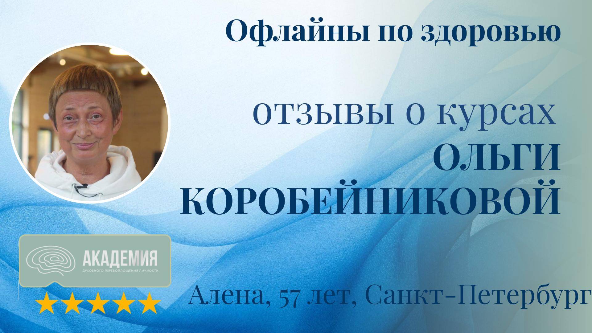 Отзывы о курсах Ольги Коробейниковой: "Офлайны по здоровью" 80. Алена, 57 лет, Санкт-Петербург - Курсы: Офлайны по здоровью Алена пришла на курсы Ольги, испытывая сильный страх смерти и потери, который побудил её начать обучение. - Результат: Обучение на курсах помогло Алене лучше справляться со страхами и обрести спокойствие. Отзывы Алены показывают, что курсы Ольги Коробейниковой помогают участникам преодолевать глубинные страхи и обрести внутреннюю уверенность и спокойствие.