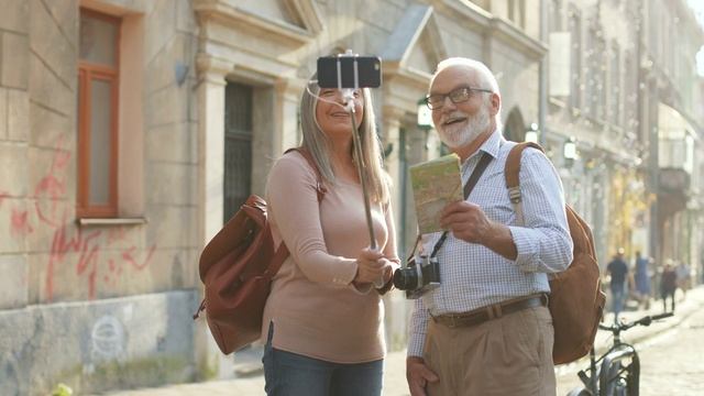 Пара туристов стоит на солнечной улице красивого города