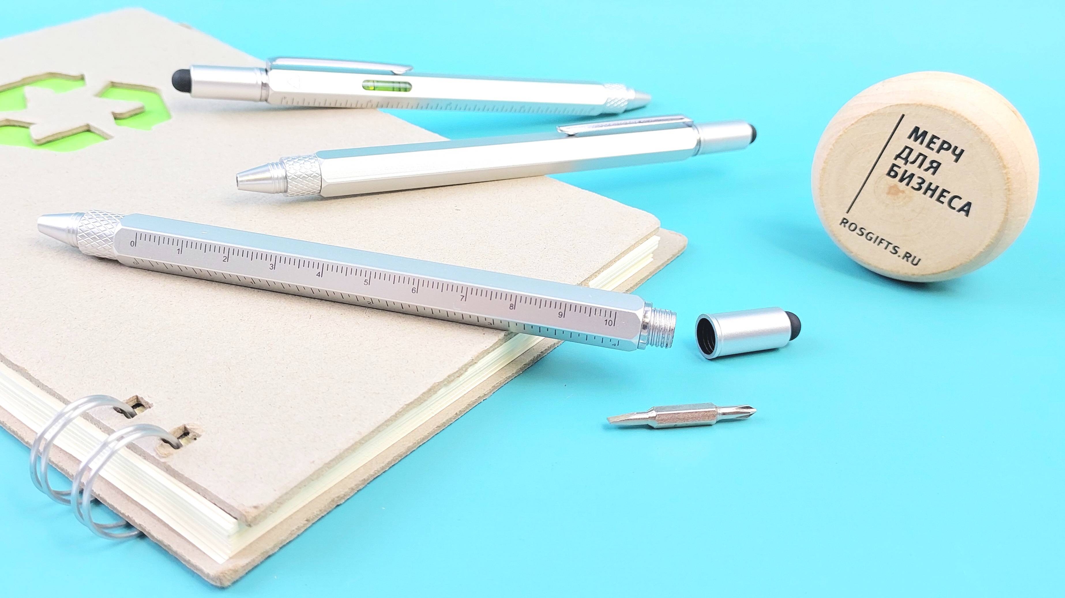 Многофункциональная шариковая ручка частично изготовлена из переработанных материалов и оснащена двусторонней линейкой, уровнем, отверткой и черным резиновым стилусом. Корпус изготовлен из переработанного алюминия с напылением серого цвета. Клип ручки хромированный изготовлен из стали. Отвертка изготовлена из стали. Верхняя часть и наконечник изготовлены из материала RABS. Цвет чернил: черный. Длина непрерывной линии: 400 метров, толщина линии письма 1 мм. Оптовый заказ от 100 штук, цены по ссылке https://rekonagrand.ru/goods/10790881