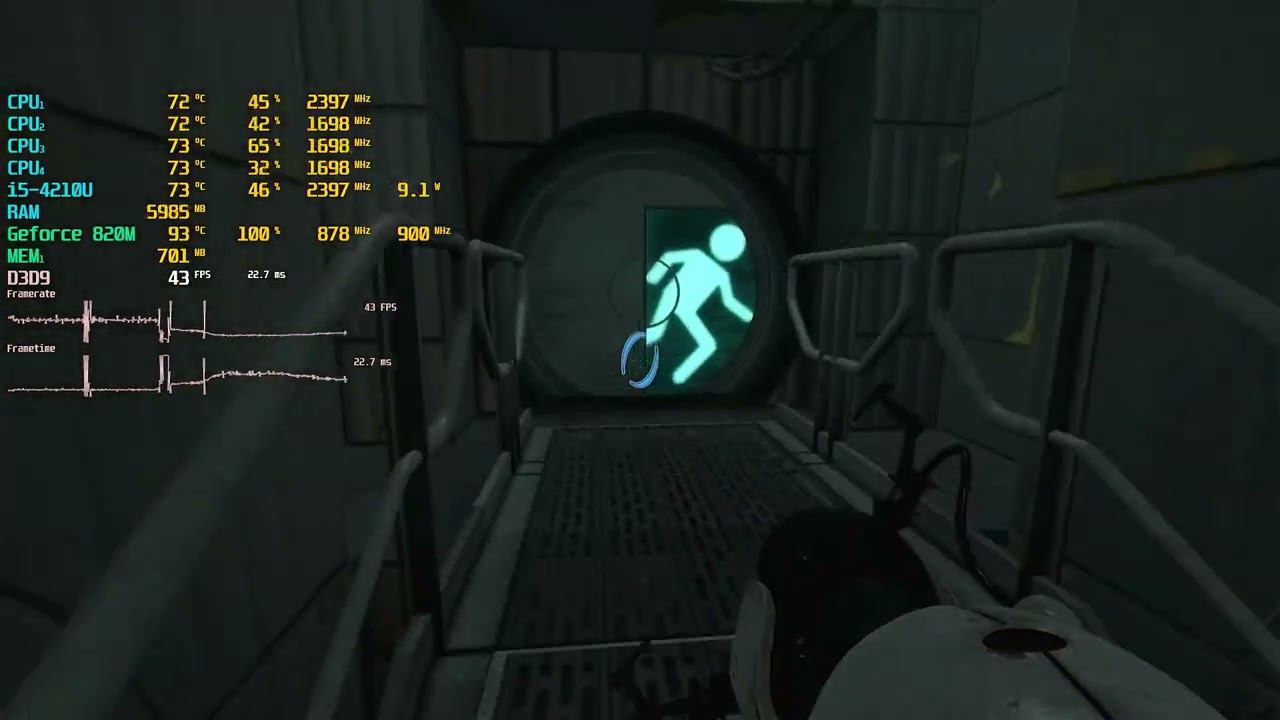 Game: Portal 2 Сomputer characteristics: Socket: BGA 1168 Motherboard: X751LD Processor: i5 4210U RAM: 12GB DDR3 1600 8GB+ 4GB GPU: NVIDIA GeForce 820M GPU2: Intel HD Graphics Family ROM: HDD 500GB OS + HDD 500GB GAMES Video in 1920x1080 resolution. Operating system: Windows 10 Pro