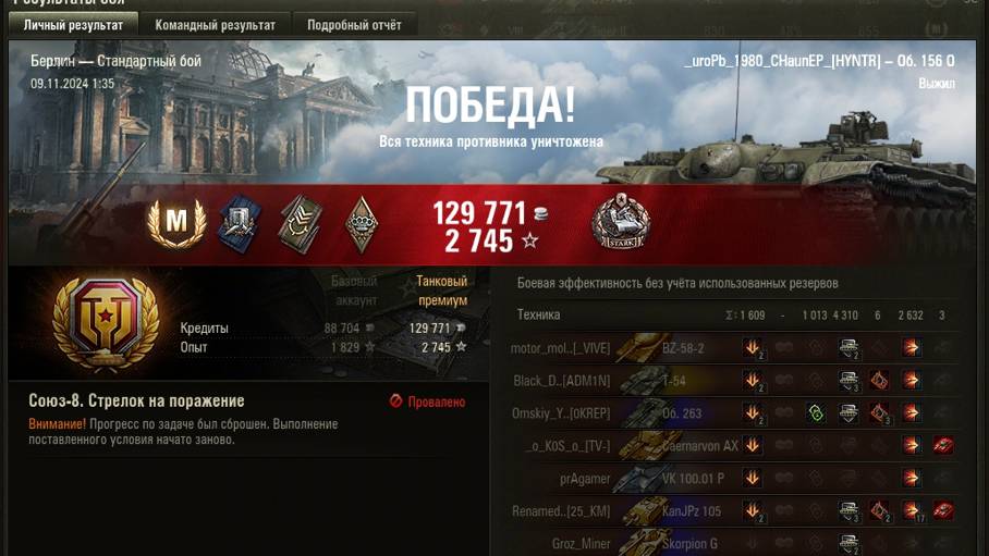 БЕРЛИН МАСТЕР на Об. 156 0 ОПЫТ: 1663 СУММАРНЫЙ УРОН: 5254 медаль СТАРКА