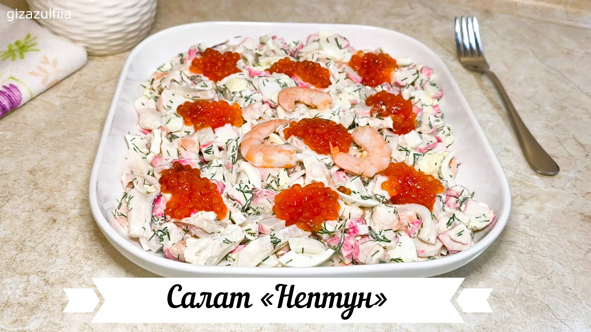 Салат «Нептун» — популярный и очень сытный салат, основным ингредиентом которого являются морепродукты. Существует несколько вариантов его приготовления, но классический рецепт обычно включает креветки, кальмары и крабовые палочки. Такой салат обязательно понравиться любителям морепродуктов и станет изюминкой вашего праздничного стола. Этот салат отлично подойдет для людей следящим за своей фигурой. В ингредиентах указан необходимый вес готового продукта для добавления в салат. Ингредиенты на 4-6 порций: Кальмары – 200 гр. Креветки – 200 гр. Яйца вареные – 3 шт. Крабовые палочки – 200 гр. Укроп небольшой пучок Икра красная – 90 гр. Майонез или сметана – 3 ст. л. Лавровый лист, соль Способ приготовления: 1. Кальмары очистить от пленки и внутренностей. В большой кастрюле (у меня 4 л.) вскипятить воду. Добавить соль и лавровый лист. И варить тушки кальмаров по одному не более 1 минуты. Достать из воды и дать остыть. Нарезать соломкой. 2. Отварить креветки в подсоленной воде (если они сырые) или просто разморозьте (если они уже варено-мороженые). Я готовые мороженые креветки окунаю секунд на 30 в ту же воду, в которой варила кальмары. Очистить от панцирей и нарезать. 3. Крабовые палочки нарезать небольшими кусочками. 4. Яйца вареные нарезать. 5. Укроп мелко нарезать. 6. Все подготовленные ингредиенты соединить в одной посуде (кальмары, креветки, яйца, крабовые палочки, укроп). 7. Заправить салат майонезом или сметаной. При необходимости досолить. Я не досаливаю. 8. Выложить салат в подходящий салатник и можно украсить красной икрой и креветками. Приятного аппетита!!! #салат #салатнептун #салаты #вкусныйсалат #белковыйсалат #ппсалат #рецептысалатов #салатсморепродуктами #праздничныйсалат #рецептсалата #салатизморепродуктов #вкусныесалаты #салатскреветками #новогоднийсалат #простыесалаты #салатнептунрецепт #простойсалат #простыерецепты #салатскальмарами #салатизкальмаров #салатнановыйгод #салатскрабовымипалочками #салатнапраздник #простойрецепт #быстрыйсалат #красивыйсалат #морскойсалат #нептун #салатнапраздничныйстол #крабовыепалочки #салатынановыйгод #праздничныесалаты #крабовыйсалат #салатнептунскрабовымипалочками