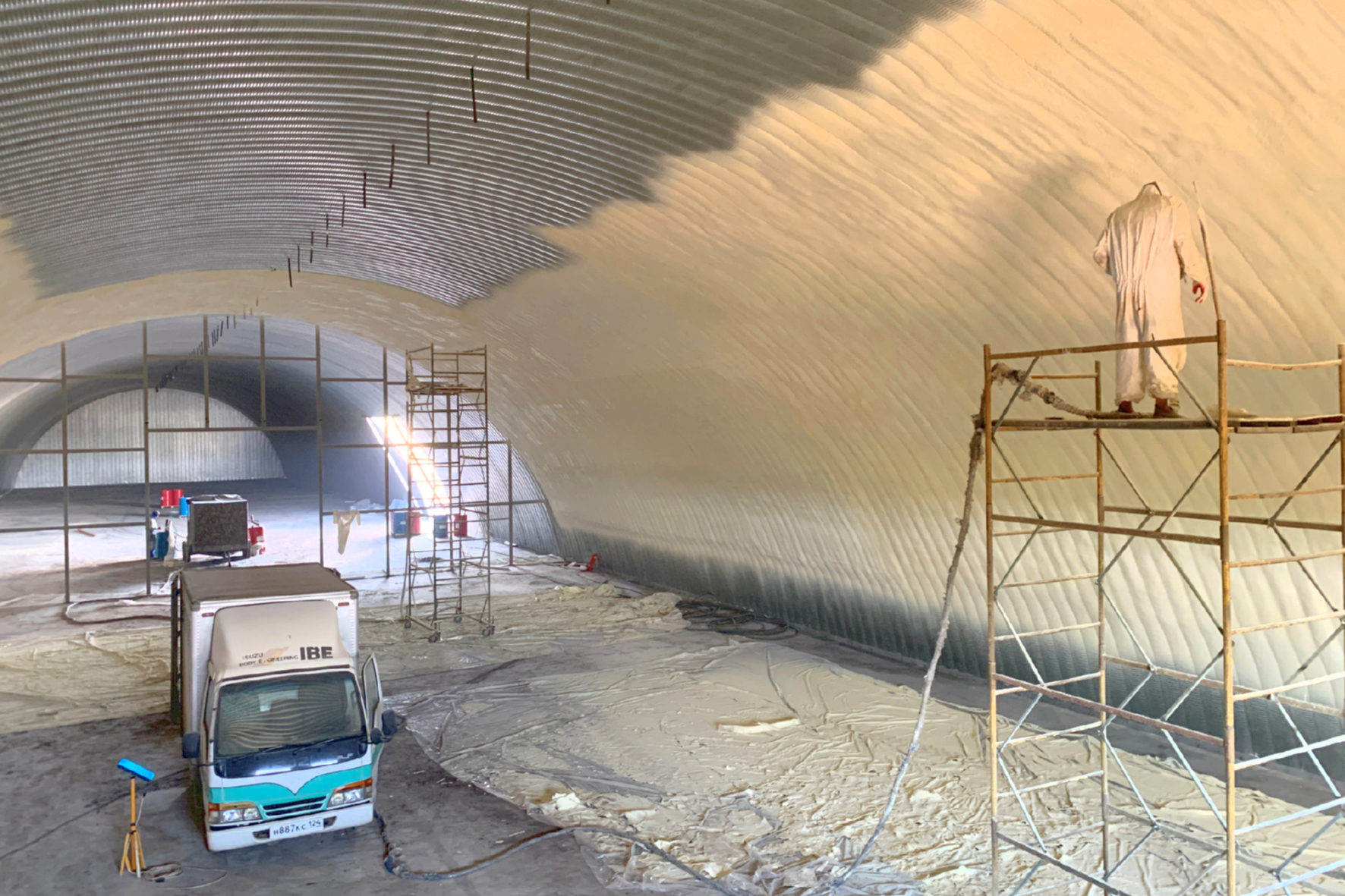 На большие объекты мы ставим в работу 2 - 3 и более установок, для повышения скорости выполнения работ. Всего в наличии у нас 5 установок от производителя Грако. Для тех, кто не знаком с данным производителем, Грако - это лучшие, на сегодняшний день установки для нанесения пенополиуретана. Производим работы в Красноярске и выезжаем в регионы.