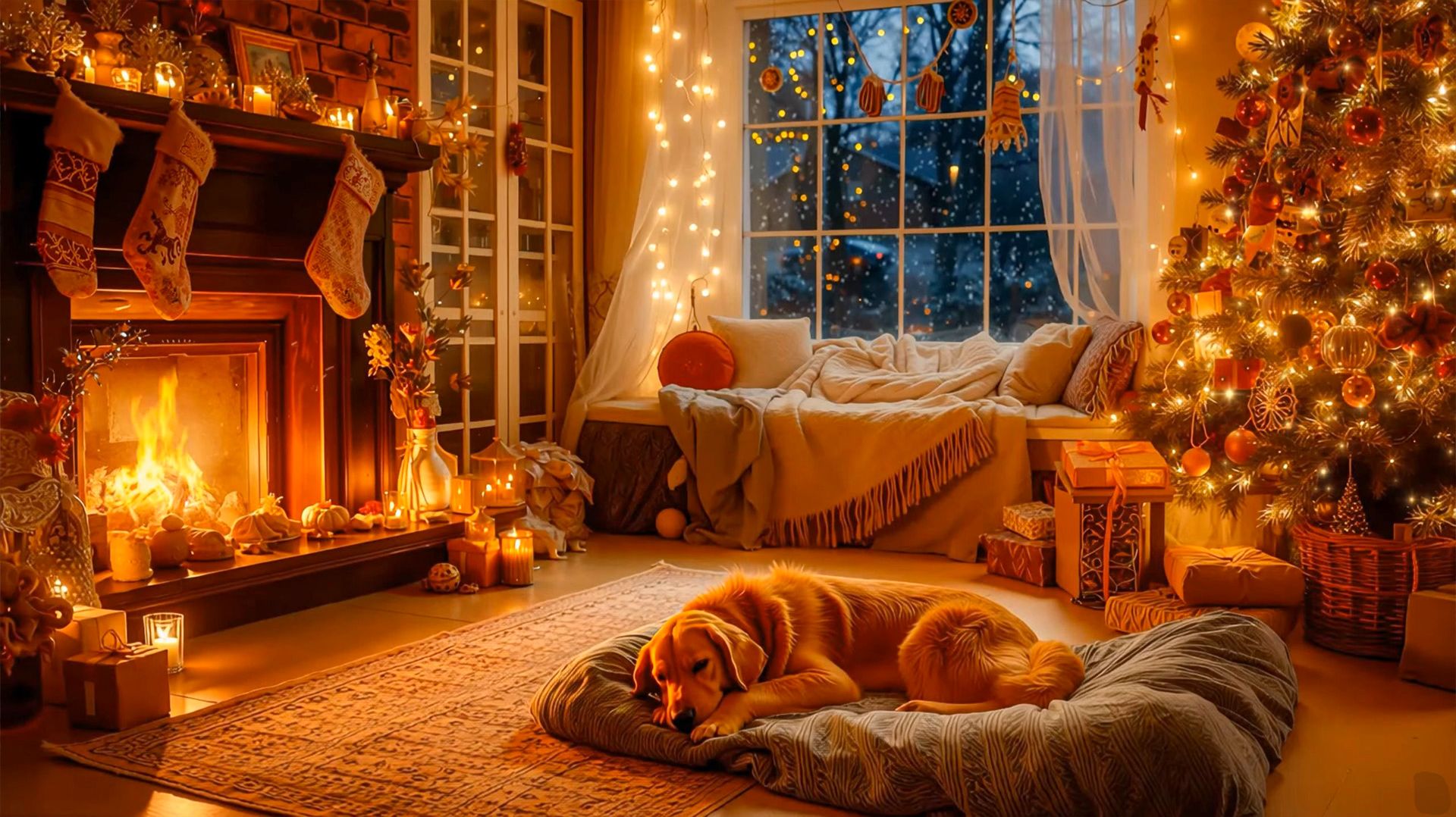 Добро пожаловать в атмосферу абсолютного уюта — тёплая комната, украшенная к Рождеству. Горящий камин наполняет пространство мягким оранжевым светом, на окнах мерцают огоньки, а за стеклом тихо идёт снег. Мягкая лежанка у камина, тёплые пледы, свечи, рождественская ёлка и спящий золотистый пёс создают идеальное настроение для зимнего отдыха. Этот ролик подойдёт для сна, расслабления, чтения, медитации, учёбы и создания праздничной атмосферы в доме. #зима #уют #камин #рождество #новыйгод #уютныйвечер #сказочныйдом #огниелки #релакс #тепло #снежныйвечер