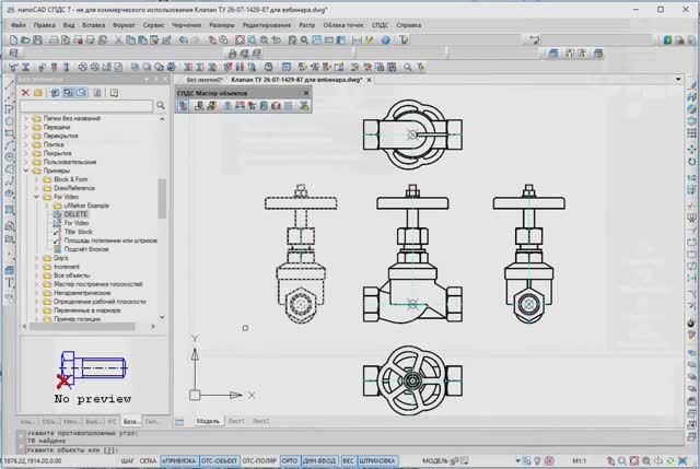 Имеем на чертеже изображение разных видов двух типоразмеров одного крана. Исходный файл: https://cloud.mail.ru/public/idax/Km7beq5ye 00:05 Создаём новую деталь в БД стандартных деталей 00:33 Добавляем «исполнение» 00:34 В контекстном меню выбираем «Непараметрическое распознавание» 00:40 Указываем нужные примитивы на чертеже. Точка вставки «Исполнения» уже есть на чертеже. Это обычная точка “Point” платформы 00:44 Добавляем новый вид для данного исполнения и в правой части указываем какому «виду» оно соответствует 01:21 Добавляем новое исполнение 01:25 Редактируем название исполнений, которые будут отображаться в свойствах платформы и в при выборе в диалоге 01:43 Последовательно выбираем графику для конкретных чертежных видов и назначаем соответствие с видами MechWizard (TVIDS) 02:30 Сохраняем объект в БД 02:33 Запускаем «Мастер скриптов» 02:37 Редактируем название объекта. И последовательно нажимаем кнопку «Вперед» 02:42 Указываем «Отображать объект во время вставки» и сохраняем скрипт 02:52 Проверяем работу детали 03:13 Проверяем редактирование видов через панель «свойства» платформы 03:19 Открываем мастер объектов 03:22 Создаем «Пользовательскую форму», нажав «Добавить форму» 03:24 Открываем форму и размещаем на ней необходимые «Элементы управления». Это «Просмотр» и «Виды и исполнения» 03:49 Находим в скрипте функцию OnDialog, удаляем или комментируем UniDialog и вместо него пишем ShowForm ("Form1"); // Где Form1 – это имя формы созданное по умолчанию. Его всегда можно переименовать.