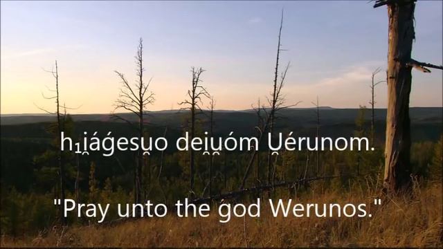 An attempt to read EIEC's 2013 translation of "The King and the God." I am not a PIE scholar! My literal-ordered translation is not that accurate. I messed up the palatals! I know! Argh This was my first video, so there are some mistakes. English translation errors: "What willest thee" (not 3rd person "willeth"), and "I will (for) a son." m-dot and n-dot are in fact syllabic resonants and not voiceless, (I'm too used to IPA, where they represent de-voicing).. I pronounced "ǵ" and "ḱ" incorrectly. Most likely palatalized [gj] / [kj]. Some of the vocalic resonants (with circle underneath), I pronounced as de-voiced. My mistake. Wérunos is related to the Sanskrit Varuṇa / Greek Ouranos / Latin Uranus
