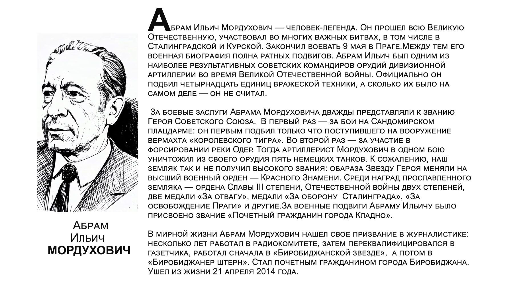 В годы Великой Отечественной войны на фронт ушли более 11 тысяч жителей ЕАО, семь тысяч наших земляков погибли или пропали без вести. Те, кто вернулись, прожили достойную жизнь. Они строили дома, выращивали хлеб, учили детей, стояли на охране правопорядка. Этим людям мы посвящаем нашу галерею "Бессмертный взвод". Среди героев - Абрам Ильич МОРДУХОВИЧ.