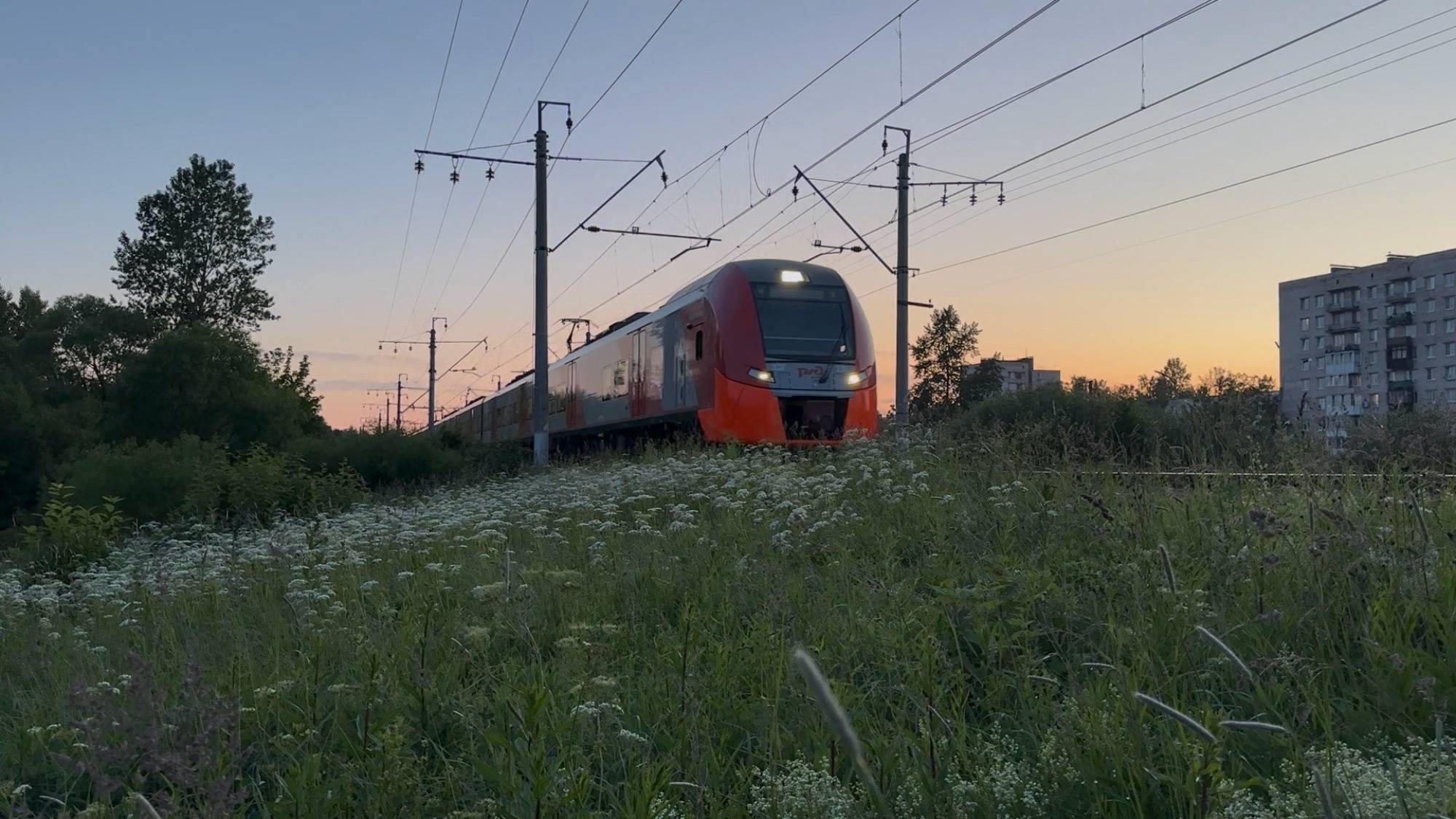 "После заката!" Электропоезд «Ласточка» ЭС2Г - 239 на перегоне и ежик в кустах, август 2021 года