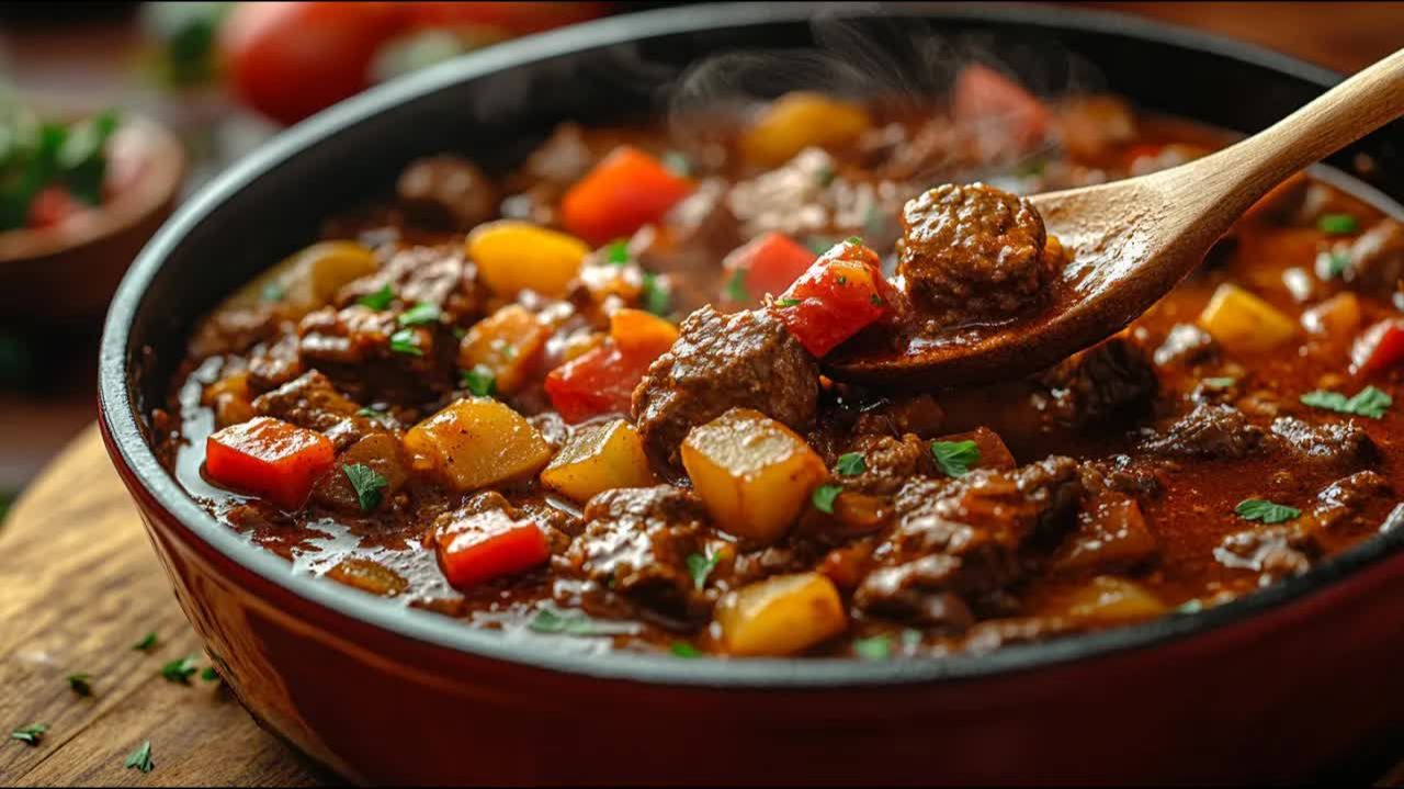 Гуляш, пахнущий домом: нежный говяжий стейк из огузка, тушеный картофель, морковь и перец в сливочном, остром соусе — именно то, что нужно в холодные дни! Я покажу вам шаг за шагом, как приготовить ароматный говяжий гуляш из простых ингредиентов, который будет готов меньше чем за час. Благодаря нежному мясу из говяжьей вырезки он становится невероятно мягким без долгого тушения — идеально для быстрого воскресного обеда или уютного ужина в будний день. Ингредиенты: 800 г говядины 2 луковицы 2 ст. л. растительного масла (примерно 30 мл) 2 моркови 2 картофелины 2 красных болгарских перца 2 ст. л. томатной пасты 1 ч. л. порошка сладкой паприки ½ ч. л. порошка копченой паприки (по желанию) 1 ч. л. соли Черный перец по вкусу 400 мл говяжьего бульона (1 1/2 стакана)