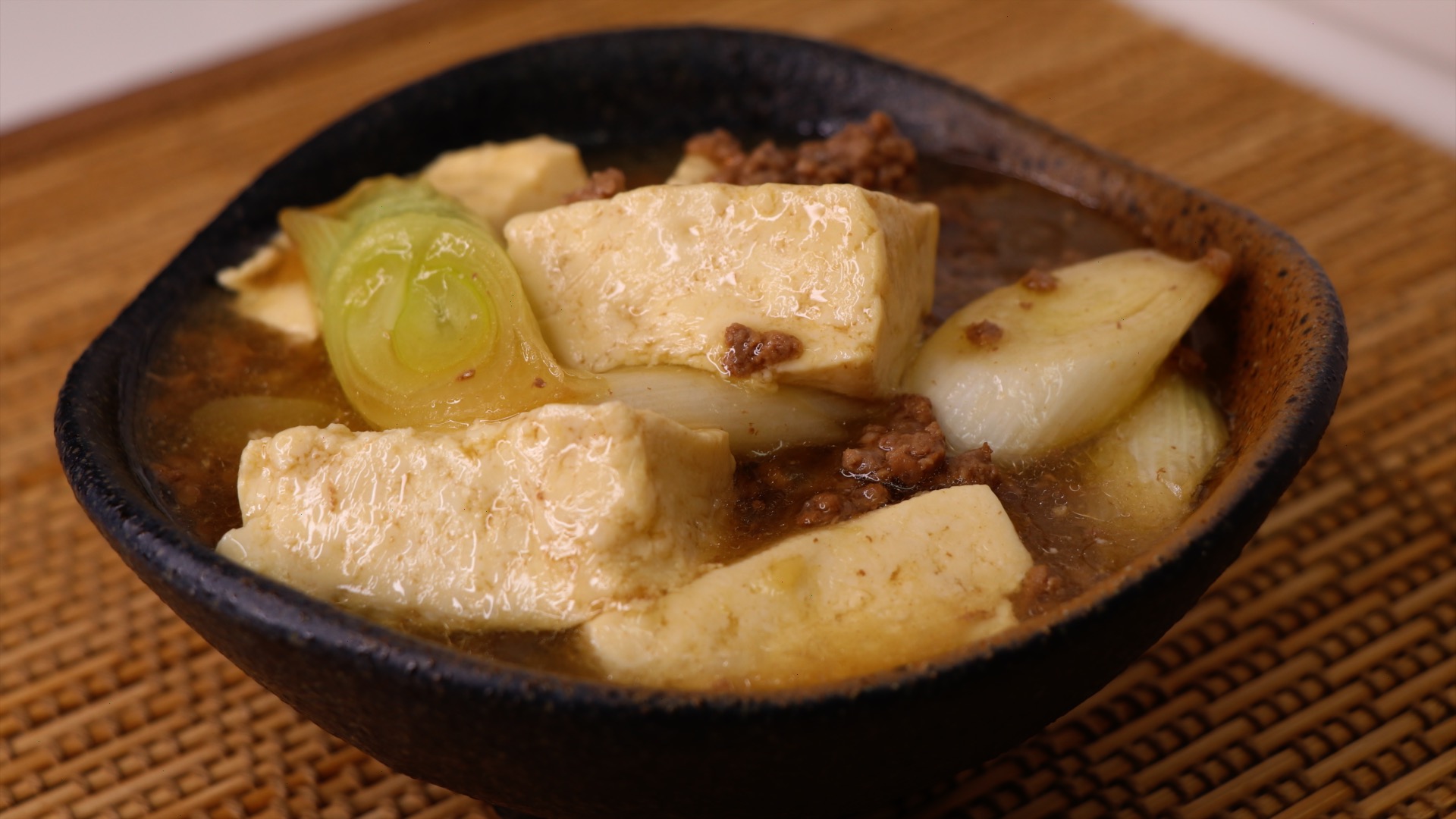 Ингредиенты: Тофу - 400 г. Фарш - 130 г. Лук Неги - белая часть одного стебля Масло растительное - 0,5 ст.л. Саке - 1 ст.л. (рисовое вино/белое вино) Вода - 100 - 120 мл. Соус Мирин - 2 ст.л. Соевый соус - 2 ст.л. Имбирь тертый - 0,5 ч.л. Крахмал - 1 ст.л. + вода 1 ст.л.