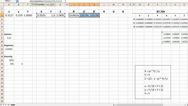The video describes the RGB color space and how to convert between xyY and RGB, both with and without gamma.