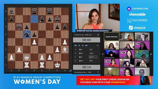 Женский командный турнир по блицу PLAY MAGNUS GROUP. Я выступаю за команду платформы COCHESS, с которой начала сотрудничество с января этого года. В эфире также появится специальный гость турнира-сильнейшая шахматистка всех времен: ЮДИТ ПОЛГАР. Поддержать канал: https://www.donationalerts.com/r/karinachess1 СКИДКА на обучающий курс "Пешечные структуры" http://bit.do/pawns-structures Подписаться на канал: https://www.youtube.com/channel/UChor8u_hhgrjX2lt0QLzZHA?sub_confirmation=1 Рада приветствовать Вас на канале женского международного гроссмейстера, международного мастера Карины Амбарцумовой! Я - профессиональная шахматистка и тренер. Здесь вы сможете найти обучающие видеоуроки по шахматам, комментарии турниров, стримы моей игры в блиц шахматы. Подписывайтесь на мои странички в соц.сетях: ВКонтакте: https://vk.com/karinachessclub Twitch: https://www.twitch.tv/karinachess1 Почта для связи: karinachess@mail.ru Мой сайт: http://chesscoach.ru/