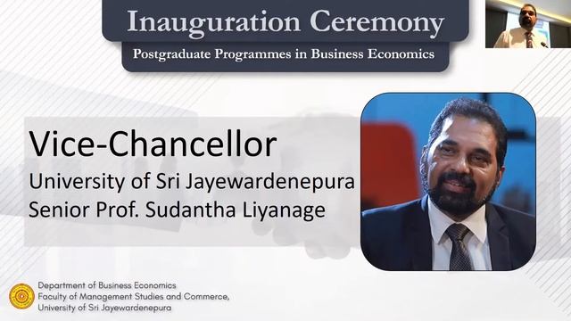 The inauguration ceremony of the Postgraduate Programmes in Business Economics offered by the Department of Business Economics, Faculty of Management Studies and Commerce (FMSC), University of Sri Jayewardenepura (USJ) for the academic year 2021 was held on the 30th of March 2021. The ceremony was held in a hybrid mode at the Faculty Board Room of the FMSC with an attendance of around 50 participants under the accepted social regulations, while many more joined the session virtually via Zoom. The event was given further prominence by the participation of Prof. W.D. Lakshman, the Governor of Central Bank of Sri Lanka, as the keynote speaker. The guest speech of the ceremony was conducted by Mr. Murtaza Jafferjee, CEO, JB Securities Ltd. The ceremony was also graced by Senior Prof. Sampath Amaratunge, Senior Professor (Chair) of the Department of Business Economics, USJ and the Chairman of the University Grants Commission, Senior Prof. Sudantha Liyanage, Vice Chancellor of USJ, Prof. P.D. Nimal, Dean of FMSC, USJ. The inauguration ceremony was concluded with great appreciation coming from the students and the academia.