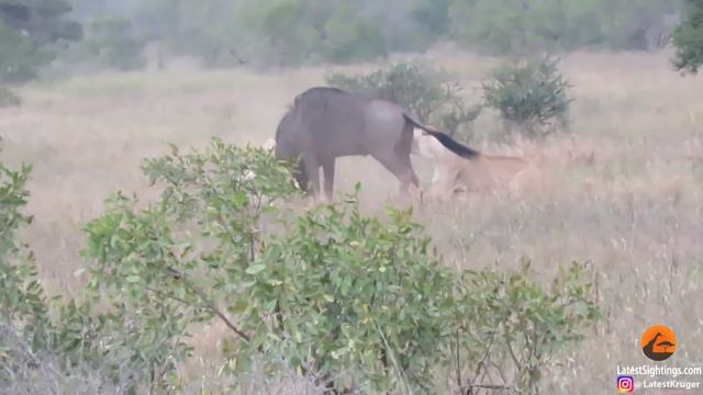 Two lionesses attack a wildebeest that fights back and hooks one of its horns into the leg of a lioness. In a twist of fate, the lionesses end up running far from the wildebeest! The spectacular fight for survival took place at Kruger National Park. Latestsightings.com shared the footage captured by Hannes Joubert, who came across the sighting about 24km north of Satara Rest Camp on the way to Olifants Camp.