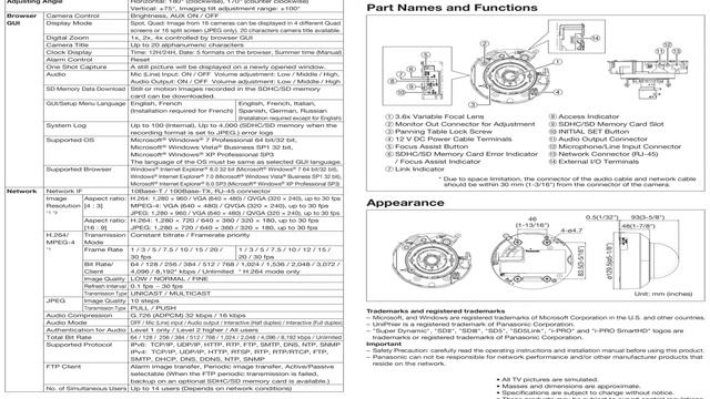 Panasonic WV-SF335 Network Camera is available at PSICOMPANY.COM. Call 1.800.826.2907 More Information on Panasonic WV-SF335 Network Camera: http://www.psicompany.com/panasonic-wv-sf335-network-camera/ Panasonic WV-SF335 Network Camera Overview: • Newly developed 1.3 Megapixel high sensitivity MOS Sensor • Multiple H.264 (High profile) streams and JPEG streams ensure simultaneous real time monitoring and high resolution recording by "UniPhier®", Panasonic's proprietary System LSI platform. • Full frame (Up to 30 fps) transmission at 1,280 x 960 image size • 720 / 30p (HD) H.264 stream in 16 : 9 aspect ratio • Wide Dynamic Range and ABS (Adaptive Black Stretch) technologies deliver wider dynamic range compared with conventional cameras. • Face Wide Dynamic Range technology ensures clear face Image. • H.264 and MPEG-4 are selectable for system migration. • High sensitivity with Simple Day/Night function : 0.3 lux (Color), 0.2 lux (B/W) at F1.3 (Wide) • Digital Noise Reduction: 3D-DNR ensures noise reduction in various conditions. • Progressive scan ensures clear images with less motion blur and no tearing even when the subject is moving. • Superior color reproduction by primary (RGB) color filter • Electronic sensitivity enhancement: Auto (Up to 16x) / OFF • Selectable light control modes: Outdoor / Indoor / Fixed electronic shutter Outdoor / Indoor: Electronic shutter and ALC lens iris control are automatically controlled depending on the mode and luminance level. Fixed electronic shutter: Up to 1/10,000 fixed electronic shutter can be selectable. • VMD (Video Motion Detector) with 4 programmable detection areas, 15 steps sensitivity level and 10 steps detection size • Face detection detect the position of human face, the information is sent by XML or video stream. • Meta data for VMD is supplied to work with the WJ-ND400 playback VMD function. • Privacy Zone can mask up to 2 private areas, such as house windows and entrances/exits. • 2x, 4x digital zoom controlled by browser • Camera title display: Up to 20 alphanumeric characters on the browser, Up to 16 alphanumeric characters embedded in the image • Alarm sources including 1 terminal input, VMD and Panasonic alarm command can trigger actions such as SD/SDHC memory recording, FTP image transfer, E-mail notification, Indication on browser, Alarm terminal output, and Panasonic protocol output. • Full duplex bi-directional audio allows interactive communication between camera site and monitoring site. • JPEG image compression ratio can be changed by alarm so that higher quality image can be provided. • Prioritized stream control: One of the video streams can be prioritized when multiple recorders or client PCs are accessing the camera so that the recorder or the client PC can maintain the frame rate. • SD/SDHC Memory card slot for manual recording (H.264 / JPEG ), alarm recording (H.264 / JPEG ) and backup upon network failure (JPEG) • H.264/MPEG-4 max. bit rate/client and Total bit rate control allows flexible network traffic management. Frame rate priority mode controls bit rate and compression ratio to provide the specified frame rate. • Alarm log, Manual REC log, FTP error log saved in the SD/SDHC memory card is displayed on the browser GUI and can be downloaded to the client PC. Playback or Image data download through the log is also available. • Internet mode: H.264/MPEG-4 images can be transmitted over HTTP protocol. • Multi-language GUI and setup menu: English, French, Italian, Spanish, German, Russian (PAL) / English, French (NTSC)* Installation required except for English • IPv4/IPv6 protocol supported • Analog Monitor output for easier installation • 2.8 mm ~ 10 mm, 3.6x Varifocal Auto Iris lens