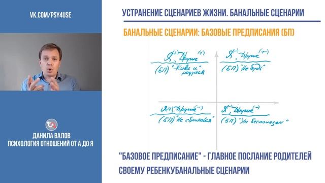 В продолжении темы: "Устранение сценариев жизни и их влияния на сферу отношений", на этой трансляции мы поговорим о замене неэкологичных "Убеждений" на экологичные, как одного из условий устранения "Сценарного процесса". Рассмотрим причину возникновения Банальных сценариев и необходимые условия для их устранения. Вы узнаете какие экзистенциальные позиции бывают, что такое: - "Декартов квадрант" - "Базовое предписание" - "Исходный сценарий" - "Дверь выхода" -------------------------------------------------- 4-я часть, "Как стать благополучником" - https://youtu.be/D8ccNbpephk 3-я часть, это видео 2-я часть, "Драйвера и убеждения" - https://youtu.be/mgXG73Mekfo 1-я часть, "Виды жизненных сценариев..." - https://youtu.be/6up9sOxoGvM ========================= НУЖНА КОНСУЛЬТАЦИЯ?! Записывайтесь по ссылке: ➡️http://valov.tilda.ws/scenario Каждую неделю провожу 2-3 консультации - бесплатно! ========================= Поддержать канал: ↘️ https://money.yandex.ru/to/41001462805715