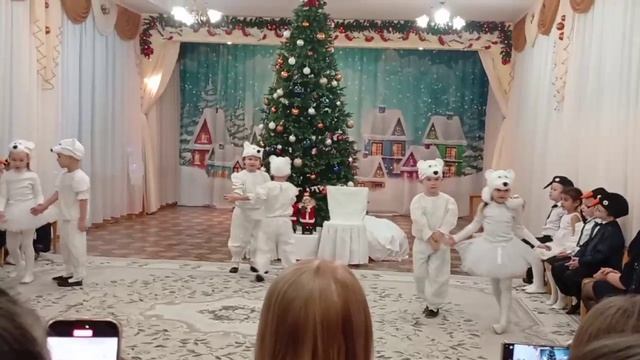 Утренник в детском саду у внучки.Внучка справа.Танец маленьких медведей.