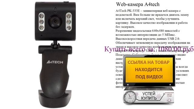 Посмотреть товар: http://electronics.urlclub.ru/WEB_camera/1229141.php A4Tech PK-333E – миниатюрная веб-камера с подсветкой. Вам больше не придется двигать лампу или включать верхний свет, чтобы улучшить картинку. Высокое качество изображения и работа без задержек. Разрешение видеосъемки 640х480 пикселей с возможностью интерполяции до 5 МПикс. Высокоскоростная передача данных USB 2.0. Обеспечивает мгновенную передачу изображения на экран и высокое качество изображения при частоте кадров 30 в секунду. USB 1.1 также поддерживается. Подсветка. Собеседнику будет вас хорошо видно даже при плохом освещении. Автоматическая настройка изображения. С автоматической установкой экспозиции и баланса белого вы всегда будете выглядеть естественно, при любых условиях освещенности. Кнопка для фотосъемки. Позволяет сделать снимок одним нажатием. Разрешение фотосъемки 640 х 480 пикселей с возможностью интерполяции до 5 МПикс. У