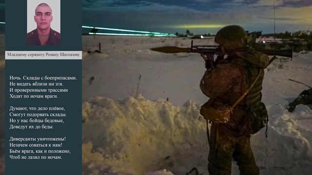 #ПОЭЗИЯСВО Младший сержант Роман Шахпазов вместе с подчиненным личным составом выполнял задачу по охране мест хранения имущества и боеприпасов батальонной тактической группы российских войск. В одно из своих дежурств Роман вел ночное наблюдение за территорией, прилегающей к местам хранения имущества и боеприпасов. Во время наблюдения младший сержант Шахпазов обнаружил приближающуюся диверсионно-разведывательную группу противника, вооруженную стрелковым оружием и гранатометами. По средствам связи Роман своевременно доложил о приближающемся противнике и открыл огонь по националистам. Осознавая возможность подрыва боеприпасов, Роман первым уничтожил гранатометчика. Противник, несмотря на превосходящие силы, столкнулся с решительным отпором, организованным младшим сержантом Шахпазовым и его подчиненными. Благодаря мужеству и героизму Романа Шахпазова, группе российских военнослужащих удалось сдержать нападение украинских националистов до прибытия основных сил, которые уничтожили диверсантов. В данной рубрике поэзия СВО звучат стихи начальника Военно-художественной студии писателей Центрального Дома Российской Армии имени М.В.Фрунзе, заслуженного работника культуры Российской Федерации Владимира Силкина в исполнении заслуженной артистки Российской Федерации Натальи Пярн. Подписывайтесь на телеграмм-канал https://t.me/cdra_ru и на наш RUTUBE-канал https://rutube.ru/channel/25861207/
