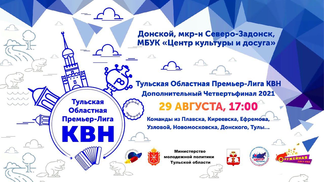 29 августа в г. Донской состоялся дополнительный четвертьфинал ТОП лиги КВН. Команды соревновались в двух конкурсах: «Приветствие» и «Биатлон». 00:00 Начало игры. 03:08 Выход команд на сцену и представление жюри. 07:19 Внеконкурсное выступление команды КВН "Рожала, знаю!" Конкурс «Приветствие»: 20:02 «6D+1». г. Ефремов. 26:26 «Патриоты юмора». г. Плавск. 32:50 «Я ухожу к маме». г.Тула. 40:42 «Бюджетная Москва». г. Новомосковск. 45:46 «Октябрята». п. Октябрьский, Киреевский район. 52:36 «Нетихий Дон». г. Донской. 1:02:22 Оценки за конкурс «Приветствие». 1:04:25 Конкурс «Биатлон». 1:13:14 Объявление итогов игры. В результате игры места распределились следующим образом: «Патриоты юмора», г. Плавск (6,0). -«Нетихий Дон», г. Донской (5,6). -«Я ухожу к маме», г. Тула (5,6). «Октябрята», п. Октябрьский, Киреевский район (5,1). «Бюджетная Москва», г. Новомосковск (4,8). «6D+1», г. Ефремов (4,7). Также членами жюри были определены специальные призы: Лучший актёр - Дмитрий Шевченко («Патриоты юмора», г. Плавск). ♀Лучшая актриса - Валерия Недобежкина («Нетихий Дон», г. Донской). Лучшая шутка - команда «Октябрята», п. Октябрьский, Киреевский район. Таким образом, полуфиналы ТОП лиги пополнились ещё 3 командами: Патриоты юмора, г.Плавск. Нетихий Дон, г.Донской. Я ухожу к маме, г.Тула. До встречи на играх ТОП-лиги КВН, друзья!