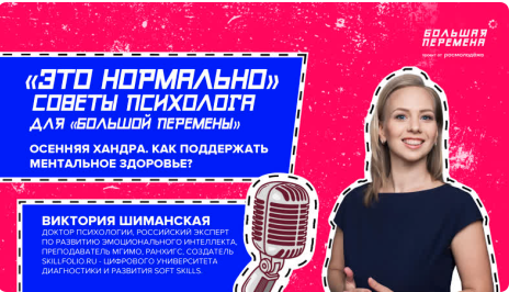 Октябрь красив, но коварен. В дождливом октябре к каждому может приблизиться осенняя грусть-тоска, хандра. Но только не к участникам «Большой перемены», потому что у нас есть 1000 и 1 способ ее преодоления. Точнее, не у нас, а у доктора психологии, эксперта по развитию эмоционального интеллекта, преподавателя МГИМО, РАНХиГС, Московского института психоанализа, создатель SKILLFOLIO.ru – цифрового университета диагностики и развития soft skills Виктории Шиманской. Специально для тебя она в рамках рубрики «Это нормально» рассказывает, как поддержать ментальное здоровье осенью. #БольшаяПеремена #ОткрывайНовое #ЭтоНормально