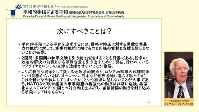 #戸田平和研究所 #ウクライナ #平和 #非暴力 戸田記念国際平和研究所では、平和創出への一助となるよう2022年より一般市民を対象とした、オンラインによる「市民平和セミナー」を開催して参ります。その第1回が下記の通り開催されました。 <第1回> 講 師:ケビン・クレメンツ博士(当研究所所長) テーマ:「平和的手段による平和:侵略的暴力に対する創造的、非暴力の挑戦」 開催日:2022年 4月23日(土) (概要) クレメンツ博士は、ロシアによるウクライナ侵攻を取り上げ、これは国際法と世界秩序を脅かすものであり、道義的・政治的・軍事的に正当化することは出来ないとした上で、国際紛争の解決のためには、平和的手段による平和の追求が唯一の道であると言及。市民の非暴力的な抵抗が機能した事例を紹介。 また、「平和とは諦めと希望の競争である」との言葉を引用しつつ、諦めの無力感がまん延すれば暴力の拡大を許してしまうと指摘し、平和構築の成否は市民一人一人の意思と連帯にかかっていると強調しました。