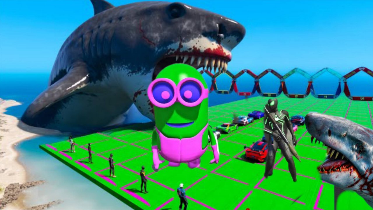 ⭐ ️ GTA 5 Океанский паркур: 8 Человек-пауков против Гигантская обожженная Акула!