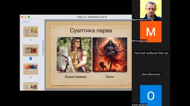 Шальяпарва (битва Бхимы и Дурьодханы. АнтиГита) Сауптикапарва (ночное нападение Ашватхаммана) Презентация: https://s.mahabharat.ru/papaVadim/pres_4.pdf 00:18 – Продолжение изучения структуры Махабхараты. Начало разбора Шалья Парвы. 01:53 – После гибели Карны командование армией Кауравов принимает царь Шалья, дядя Накулы и Сахадевы. 03:29 – Трагедия Шальи: он по опрометчивой клятве вынужден служить Дурьодхане, а не своим родственникам-Пандавам, демонстрируя принцип верности слову. 04:51 – Ключевой момент парвы – поединок Юдхиштхиры и Шальи. Мягкий Юдхиштхира берет на себя ответственность за убийство Шальи, чтобы избавить от этого младших братьев. 05:52 – После гибели Шальи и Шакуни в живых из Кауравов остаются лишь трое: Крипа, Критаварман и Ашваттхаман. Дурьодхана тяжело ранен. 06:37 – Дурьодхана, олицетворяющий трудноодолимые животные позывы (васаны), скрывается в озере, используя варуна-йогу. 09:12 – Финальная битва на палицах (Гада-Юдха Парва) между Бхимой и Дурьодханой. Война не окончена, пока жив главный противник. 11:03 – Удар Бхимы по бедру Дурьодханы – формальное нарушение правил, но кармически оправданное как воздаяние за оскорбление Драупади и убийство Абхиманью. 12:08 – Удар по бедру – кармическая симметрия: исполнение собственного непристойного жеста Дурьодханы, которым он звал Драупади. Это символизирует победу над главным животным позывом – половым влечением. 16:36 – Урок о Дхарме и правилах: цель оправдывает средство только в крайнем случае и ради высшей правды, но это не оправдание любого насилия. Правила – средство, а не сама цель. 19:47 – Победа не приносит радости. Пандавы чувствуют горечь и опустошение – урок о невозможности найти окончательное удовлетворение в плодах действий в сансаре (непривязанность к плодам). 27:40 – Начало Сауптика Парвы (Книги о ночном нападении). Ашваттхаман, мстя за смерть отца (Дроны), убитого с нарушением правил, решает атаковать спящий лагерь Пандавов. 30:24 – Ночная резня: Ашваттхаман, Крипа и Критаварман убивают спящих Дхриштадьюмну, Упапандавов (сыновей Пандавов) и других воинов. Действие совершается в тамасе (невежестве), под маской долга. 39:52 – Ашваттхаман применяет брахмастру. Арджуна отвечает тем же. Кришна помогает Арджуне отозвать оружие – урок о необходимости уметь останавливаться на пороге необратимого. 42:00 – Наказание Ашваттхамана: с него снимают лобный драгоценный камень – символ мудрости и статуса. Он обречен на вечные скитания, но в будущем станет учителем Вед. 51:50 – Скорбь и проклятие Гандхари. Город оплакивает павших. Гандхари, узнав о гибели сыновей, проклинает Кришну и его род Ядавов, что показывает силу майи и человеческой боли даже при знании об иллюзорности происходящего. 53:14 – Откровение Кунти: Карна был старшим братом Пандавов. Это рушит иллюзорную границу между "своими" и "чужими". 54:07 – Утешение скорби: на берегу Ганги являются души павших воинов, сияющие и примирившиеся. Это демонстрирует более широкий взгляд на войну, где все участники были необходимы для божественной лилы (игры).