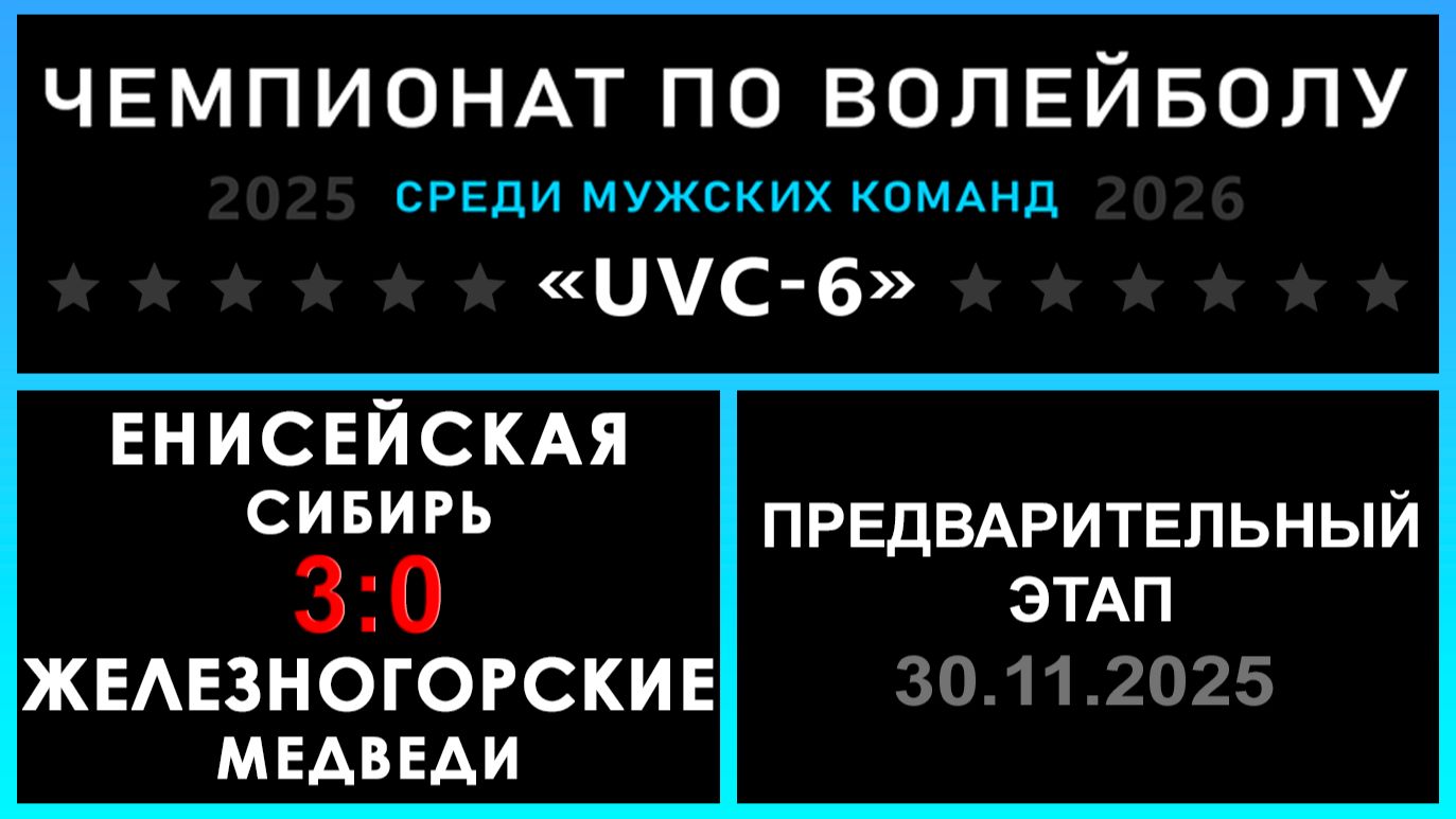 UVC-6 (Мужчины): Чемпионат UVC Лиги по волейболу среди мужских команд 2025-2026 гг. Результаты игры: Предварительный этап 30.11.2025 Енисейская Сибирь - Железногорские медведи 3:0 (25:8, 25:13, 25:16) Енисейская Сибирь провела безупречный Предварительный этап и отправляется в TOP LEVEL! Железногорские медведи пока показывают удивительные результат - 0:9 ... ! «РЕШАЛЫ» - конкурс для команд : ✅ Енисейская Сибирь идет дальше! «Nostradamus trophy» - конкурс для участников группы ВКонтакте: ✅ 67 - количество участников, которые смогли предсказать точный исход матча! #UVC_ЛИГА_ЧЕМПИОНАТ_UVC_6_Мужчины
