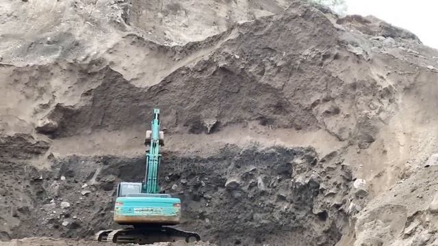 Добыча песка экскаватором в горах. Индонезия.