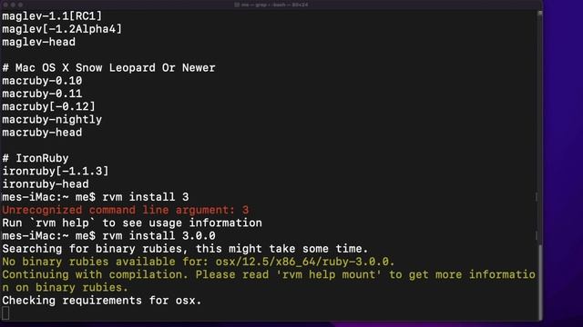 This short video will exactly explain - How to install ruby using rvm Mac Hope, you can easily install ruby using rvm Mac Join this channel to get access to perks: https://www.youtube.com/fewsteps?sub_confirmation=1 RUBY useful commands: $ rvm list known # lists all of the known ruby packages $ rvm install 2.1 # install the latest version of ruby-2.1.x $ rvm use 2.1 # use ruby-2.1.x $ ruby -v # which version of ruby are you currently using $ which ruby # what location is the ruby binary being sourced from $ rvm use 2.1 --default # set the specified version to be the default version of ruby #fewsteps #ruby #rvm