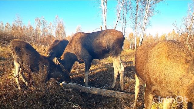 Редкий случай. У лосихи три лосенка.