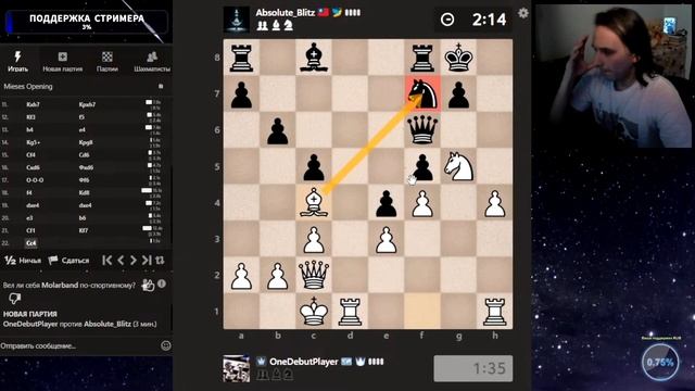 Друзья, всем привет. Партия со стрима, представляю вашему вниманию. Шахматы. Блиц 3+0 на chess.com. Если интересно, - подписывайтесь на канал, ставьте лайки, оставляйте комментарии. Поддержка через: DonationAlerts: https://www.donationalerts.com/r/onedebutplayer Бусти: https://boosty.to/onedebutplayer/donate Donatepay: https://new.donatepay.ru/@1272445