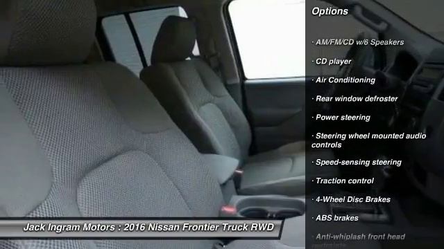 2016 Nissan Frontier S http://www.JackIngram.com For more information on this vehicle and our full inventory, call us at 334-420-7700 Jack Ingram Motors 227 Eastern Blvd. Montgomery AL 36117 You'll NEVER pay too much at Jack Ingram! You NEED to see this truck! How economical is this! Just in, this charming 2016 Nissan Frontier comes with a 4.0L V6 DOHC engine and 5-Speed Automatic with Overdrive. This fantastic Frontier is the gas-saving truck with everything you'd expect from Nissan, and THEN some. Visit our virtual showroom 24/7 at jackingram.com, or stop by our used car lots in Montgomery, Alabama to view all of our used cars. Price includes: $250 - Nissan Customer Cash. Exp. 05/02