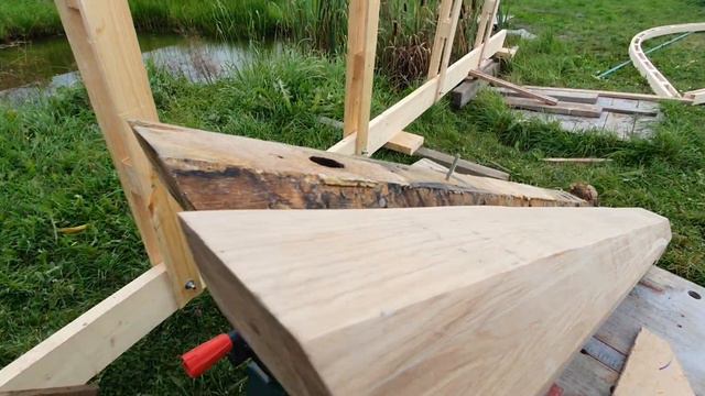 Форштевень получился в отличном качестве, мы его сделали с запасом прочности . Строительство ангара подходит к завершению . Дима подгоавливает форштевень к установке.