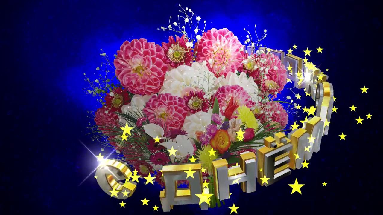 Шикарный футаж БУКЕТ ЦВЕТОВ С ДНЁМ РОЖДЕНИЯ на тёмно-синем фоне с эффектом звёзд