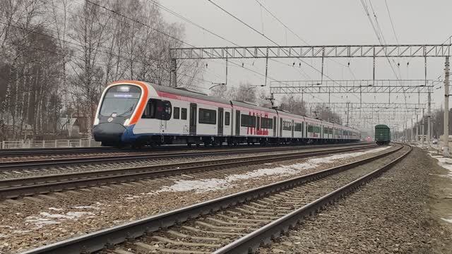 Электропоезда ЭГЭ2Тв-030 и ЭГЭ2Тв-009 "Иволга", станция Быково