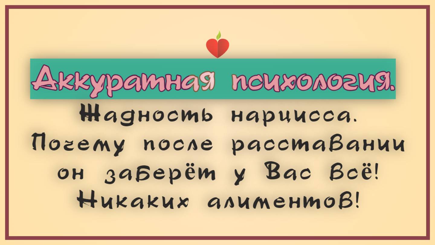 Хочешь узнать почему у тебя в жизни так? Смотри и читай "Аккуратную психологию". ПОЛЕЗНЫЕ видео: Мужчина- нарцисс и его отношение к детям и браку. https://rutube.ru/video/82be7b7241d74c7857f3fef4c7e40aad/ 1. Группа в ВК: https://vk.com/club225650308 2. Ссылка на мою личную страницу: https://vk.com/vncpsiholog 3. Ссылка на группу в ТГ: t.me/VNCpsiholog\ 4. Запасной канал https://www.youtube.com/watch?v=KM5A2Smz5Mw&t=10s #нарциссическоерасстройстволичности #НРЛ #созависимыеотношения #НРЛ #абьюз #созависимыеотношения #нарциссическоерасстройстволичности #аккуратнаяпсихология #психологиясозависимости #абьюз #НРЛ #созависимыеотношения #ВДА #ВДАпсихолог #взрослыедетиродителейалкоголиков #признакисозависимости #типысозависимыхотношений #паттерн #психология #сепарациясродителями #аккуратнаяпсихология #разводснарцем #жадностьнарцев ПОДПИШИСЬ: Группа в ТГ:https://t.me/VNCpsiholog Группа в ВК:https://vk.com/club225650308 Запасной канал: https://www.youtube.com/watch?v=9lldoENpe_c ОБО МНЕ: https://vk.com/vncpsiholog