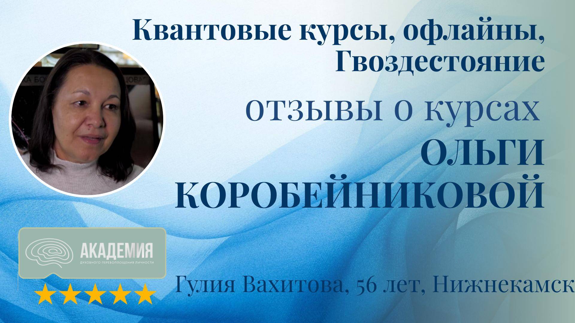 Отзывы о курсах Ольги Коробейниковой: "Квантовые курсы", офлайн-сессии, "Гвоздестояние" 75. Гулия Вахитова, 56 лет, Нижнекамск - Курсы: Квантовые курсы, офлайн-сессии, Гвоздестояние Гулия отмечает, что Ольга доносит ценные знания, которые открывают глаза и дают толчок к активной жизни. - Точка А: Начало пути Гулия пришла с недостатком энергии, чувствуя отсутствие радости и стремясь глубже познать себя и окружающий мир. - Путь к изменениям Практикуя гвоздестояние, проходя курсы и выполняя рекомендации Ольги, Гулия начала трансформационный процесс. - Точка Б: Результаты после курсов Ольги Коробейниковой После курсов Гулия ощутила радость и прилив энергии, которых ей не хватало ранее, а также получила ответы на многие свои вопросы. Отзывы Гулии подчеркивают, что курсы Ольги Коробейниковой помогают участникам наполнить жизнь энергией, радостью и пониманием, открывая новые перспективы и осознания.