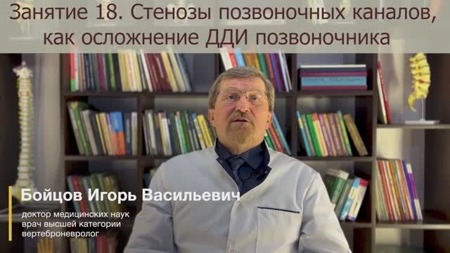 Наше сегодняшнее занятие - это анализ ранее озвученных нами ортопедических осложнений дегенерации тканей позвоночника, которые в итоге приводят к очень грозным по своим последствиям для здоровья пациента изменениям в позвоночном столбе. Итак, тема нашего занятия: "Стенозы позвоночных каналов". Занятие проводит д.м.н. Бойцов Игорь Васильевич