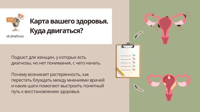 🎉🎁 Ваш подарок за участие в канале "вопрос-ответ" 1️⃣🎙 Подкаст: Карта вашего здоровья. Куда двигаться? Аудио для женщин, у которых есть диагнозы, но нет понимания, с чего начать. Я объясняю, почему возникает растерянность, как перестать блуждать между мнениями врачей и какие шаги помогают выстроить понятный путь к восстановлению здоровья. Слушать подкаст: 🔹️Rutube https://rutube.ru/video/private/62f35924e76565c3480c17cb1039093b/?r=a&p=xPFLkZxUQl8PB4yCfFe-ow 🔸️Youtube https://youtu.be/rbwEG4gwa2I?si=n0nFXQfUjRHL5Hev 2️⃣ ✅️ Чек-лист "Как поддержать здоровье при лечении гинекологических заболеваний" https://drive.google.com/file/d/1oKDdTIR-t_Vu4wyxNuKVkqNimBAbn3FU/view?usp=drivesdk 3️⃣ 🎫 Промокоды на скидку 300 руб.: - Промокод ЛИЧНО для личного вопроса, (стоимость со скидкой 600 руб.). https://shefova.online/p/f935a5/ -Промокод ВОПРОС дает скидку для вступления в Клуб (есть разные тарифы с разной стоимостью). https://shefova.online/p/a78413/